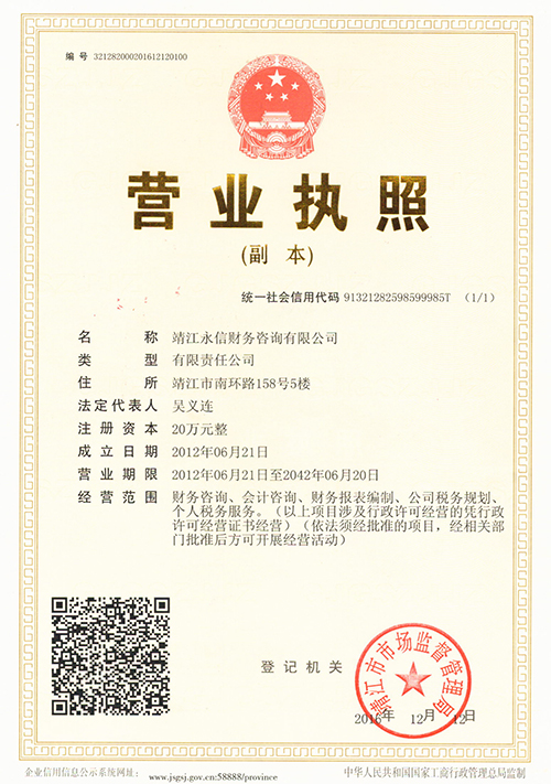 靖江永信財務咨詢有限公司是依法注冊成立的專業(yè)財稅代理機構(gòu)。公司主要業(yè)務為:代辦公司營業(yè)執(zhí)照、注冊各類公司、代理記賬報稅,代理商標注冊,工商年檢,稅務登記年檢,企業(yè)清理注銷等,注冊香港公司,代辦申請一般納稅人資格認定,公司專業(yè)為中小企業(yè)進行納稅籌劃,代理記賬報稅,企業(yè)內(nèi)部審計;同時也專業(yè)代理進出口經(jīng)營權(quán)申請。